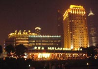 ということで、黄浦江を渡って浦東(プートン)へ出かけてみましょう。おなじみ東方明珠テレビ塔付近から黄浦江へ向かうと、そこには「濱江大道(ピン・ジャン・ター・タオ)」と呼ばれる全長2500mの長い長い散歩道がひろがっています。この濱江大道の「南濱江/富津段」から外灘をみれば、うれしいことに外灘の夜景を一望することができるのです。
